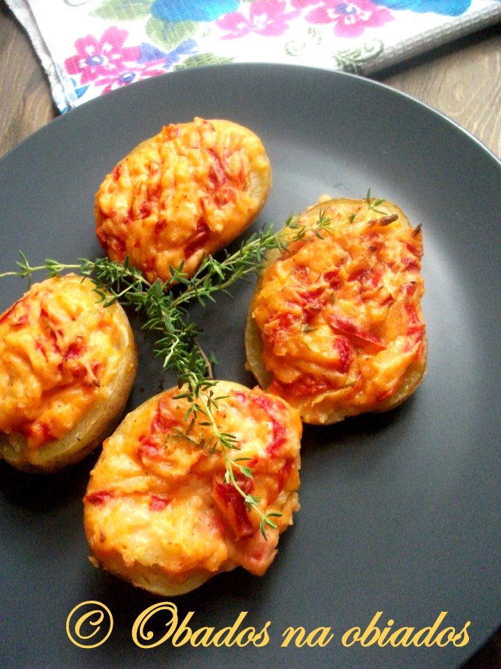 Ziemniaki przekrawamy na połówki. Delikatnie wydrążamy uważając by nie przebić brzegów. Wydrążony miąższ łączymy z pokrojoną papryką, serkiem mascarpone.. Doprawiamy tymiankiem, solą oraz pieprzem. Dokładnie mieszamy. Tak przygotowanym farszem napełniamy łódeczki ziemniaków.